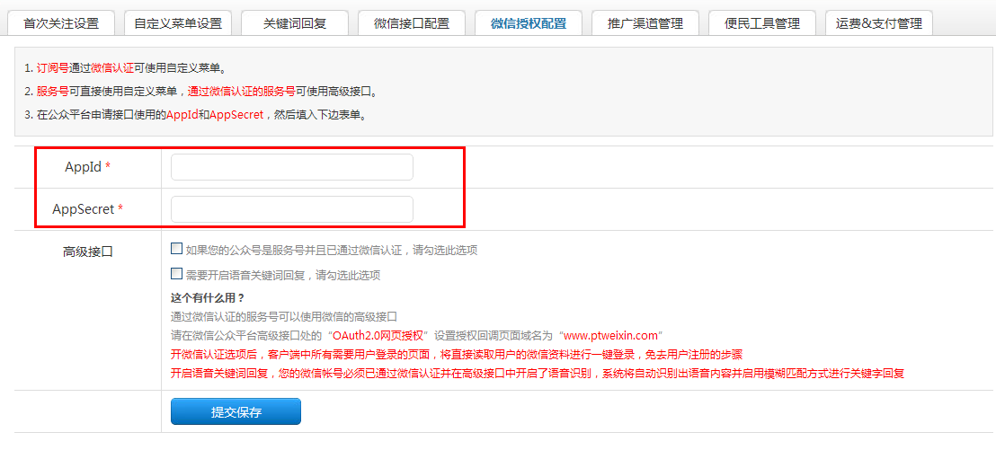 后台微信授权配置必须填写正确