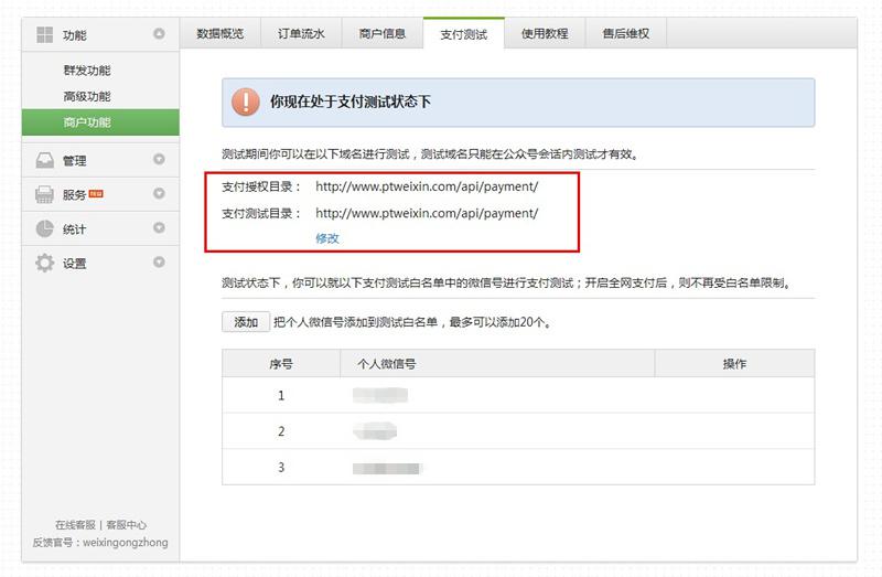 以上是标准接口的获取参数方法和填写方法,如商户功能尚未全部审核通过,可以登录公众平台申请支付测试。其中支付测试目录与支付授权目录一致。