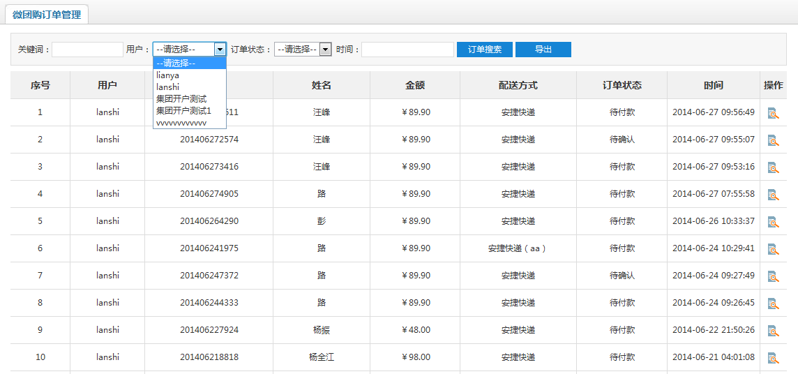 微团购-查看旗下所有帐号的订单,并可修改订单记录,多条件筛选订单和导出订单