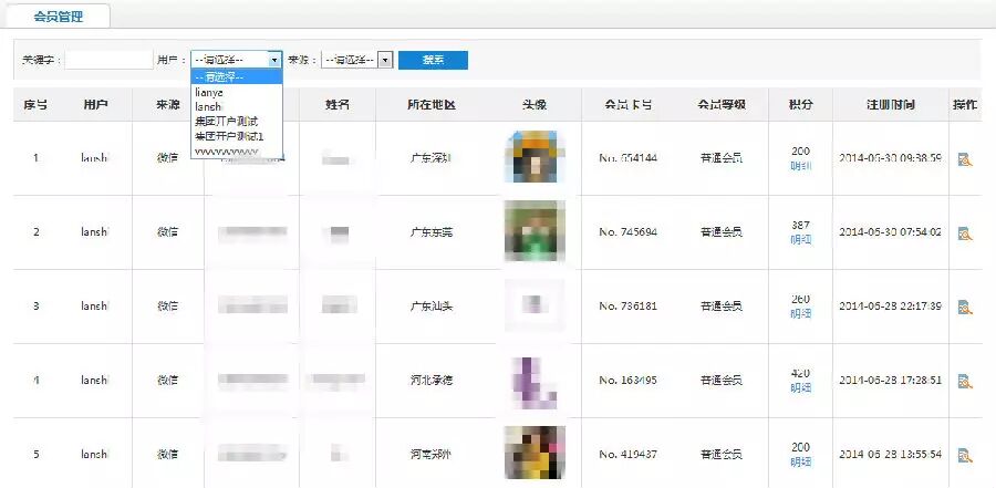 微会员-查看旗下所有会员,并可按分门店分级别筛选会员记录,针对每个会员可详细查看其积分获取或使用的详细记录,并可按条件导出会员数据